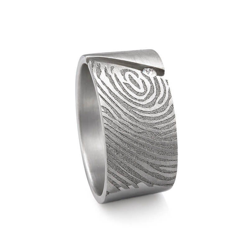 Deze edelstalen ring wordt met de hand gemaakt en gepersonaliseerd met de door u aangeleverde vingerafdruk. Een deel van de afdruk wordt op de buitenzijde van de ring gegraveerd.